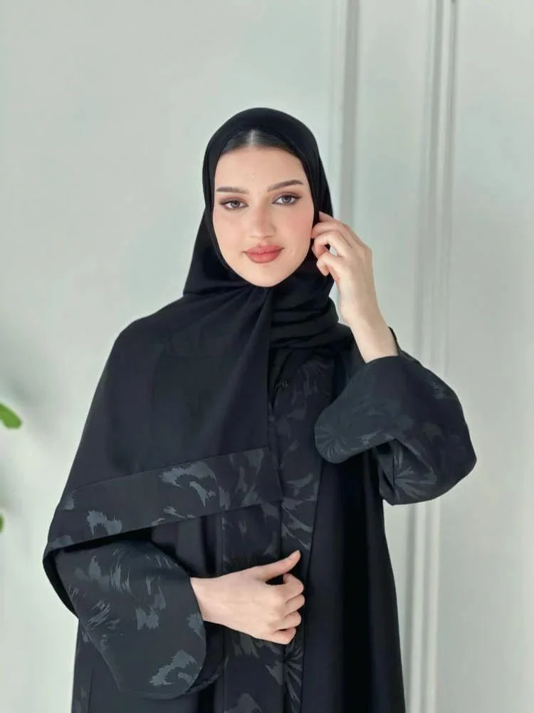 عباية سوداء مزخرفة بتصميم أنيق يعكس التوازن بين الفخامة والعملي مزينة بزخارف ناعمة تضيف لمسة من التميز والرقي، مصنوعة من قماش فاخر يوفر الراحة والانسيابية مما يجعلها خيارًا مثاليًا للإطلالات اليومية والمناسبات الخاصة.