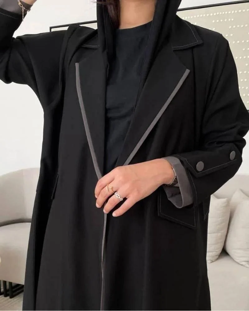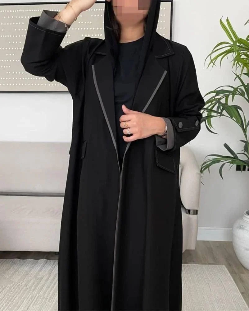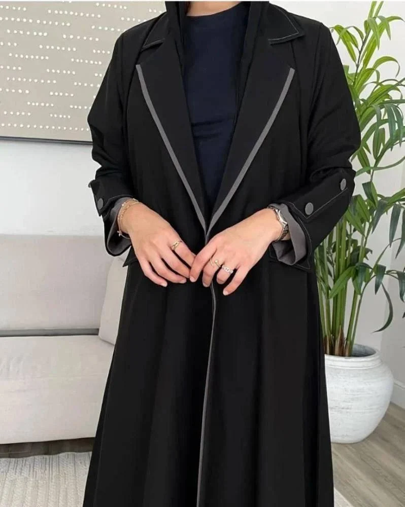 عباية عملية مصممة بأناقة لتناسب أوقات العمل اليومية، تأتي بلون أسود راقٍ مع لمسة من الأناقة الحديثة بفضل التدخيلة المميزة من اللون الرمادي الغامق عند الياقة ، و الأكمام مزينة بأزرار متقنة تضفي عليها لمسة من التفرد والاحترافية ، تصميمها العصري يضمن الراحة في الحركة بينما تبقى الأناقة سيدة الموقف ، مما يجعلها الخيار المثالي للسيدات الباحثات عن الأناقة العملية في بيئة العمل.