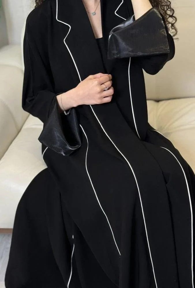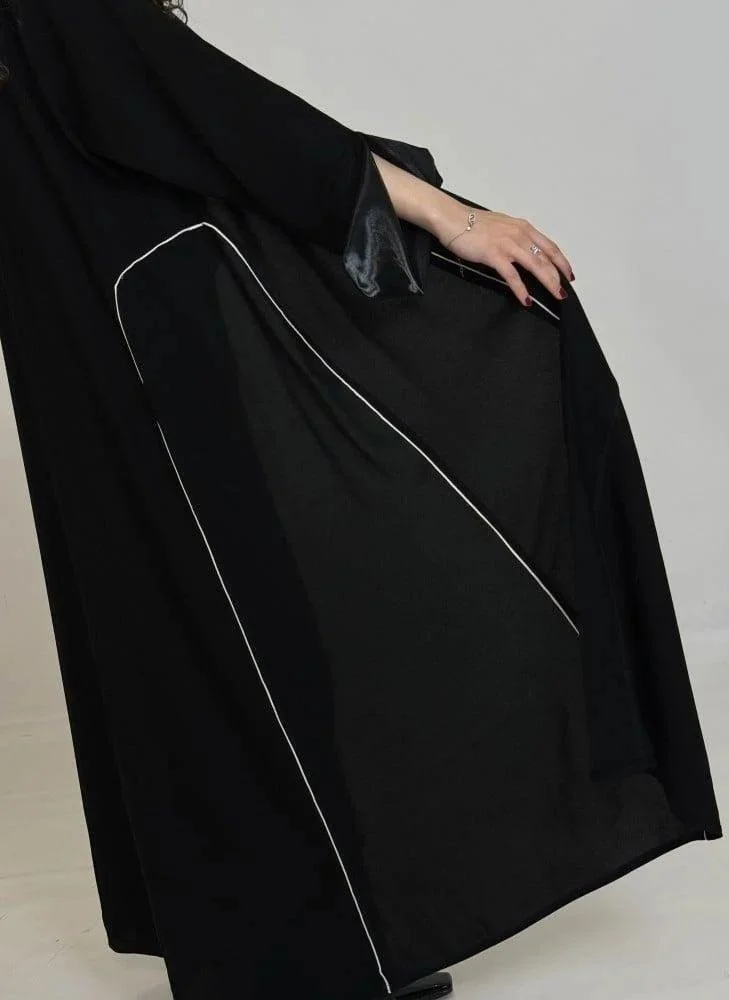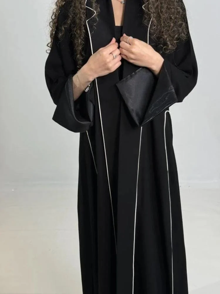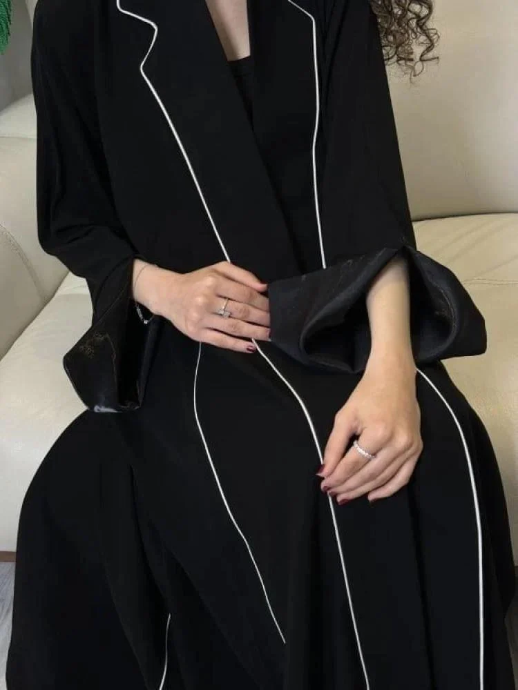 عباية بأزرار مخفية أنيقة بتصميم عصري وعملي تأتي بقصة كلاسيكية وياقة رسمية تضيف لمسة من الرقي والاحترافية مع أزرار مخفية تعزز انسيابية المظهر وتمنح العباية مظهرًا مرتبًا وأنيقًا، الحواف مزينة بخطوط بيج ناعمة تضيف لمسة أنثوية راقية تبرز جمال التصميم وتجعله مثاليًا للمناسبات المختلفة.