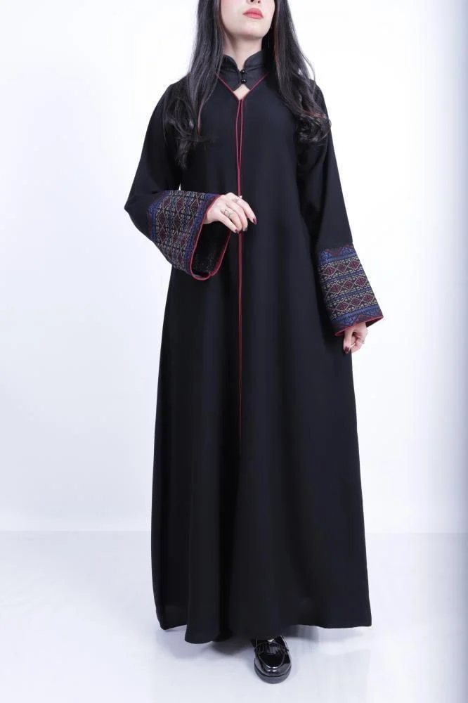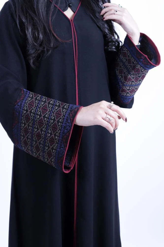 • الأكمام مزينة بتدخيله من التطريزات الكشميري بألوان زاهية ومتناسقة، تضيف لمسة فخمة ومميزة.